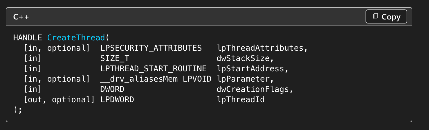 After allocating memory, we can use CreateThread to execute the allocated memory within the virtual address space of the process. The important value here is lpStartAddress, which is a pointer to where the payload is located.