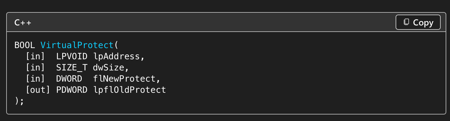 BOOL vp = VirtualProtect(buffAddr, bufSize, PAGE_EXECUTE_READ, &lpflOldProtect);