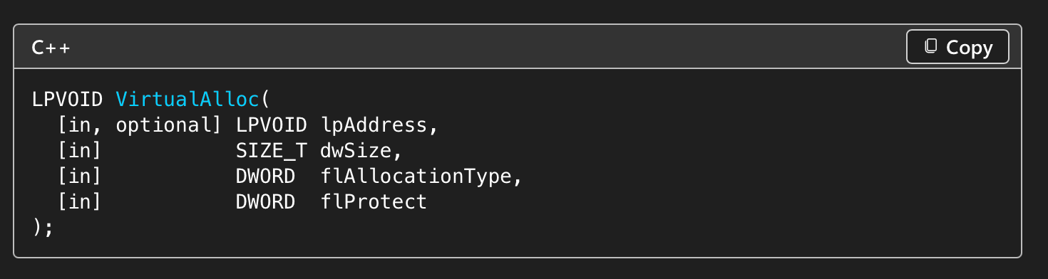 Then, we want to store that payload inside the current process memory and make that region executable. This can be achieved with the VirtualAlloc function.